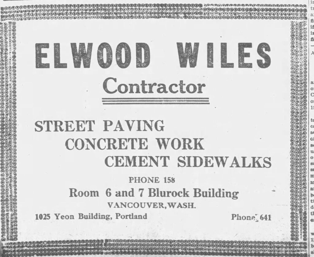 Though based in Portland, Wiles regularly crossed the Columbia to take on contracts in Vancouver. With the city’s 1908 sidewalk overhaul creating steady work for cement contractors, Wiles was one of several out-of-town professionals brought in to meet demand. His sidewalk stamps—typically reading “Elwood Wiles” along with a date—can still be found embedded in Vancouver’s older neighborhoods.