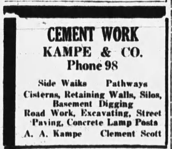 Kampe & Co. was a partnership between Alfred Alex Kampe and Clement Scott. While Kampe & Co. installed cement sidewalks for the city, they did much more than just sidewalks. In the April 26, 1920, issue of The Columbian newspaper, Kampe & Co. advertised sidewalks, cisterns, retaining walls, silos, basement digging, road work, excavating, street paving & concrete lamp posts. Their first contract with Vancouver was for grading and graveling improvements on S St. from St. Johns Rd. to the city limits. They advertised heavily in the Columbian newspaper, first with classified ads, then later with larger business ads. Alfred Kampe and Clement Scott dissolved their partnership on October 7, 1921