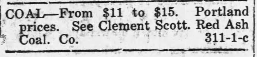 In 1910, Clement Scott purchased the Red Ash Coal Company starting with just one employee. He build the business to become the largest fuel operator in S.W. Washington and employing 30-50 men with an annual payroll of over $50,000.