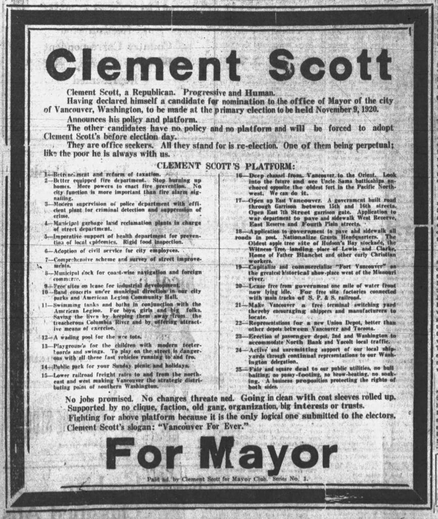 In the lead-up to Vancouver, Washington’s mayoral election held on November 9, 1920, Clement Scott emerged as a well-known candidate. A prominent Elk and local civic leader, Scott served as the president of the Washington State Association of Elks, past exalted ruler of the local lodge, and president of the Chamber of Commerce. His campaign was energetic—he spoke to thousands in streetcars, barber shops, and restaurants—and while straw polls often favored his opponent John P. Kiggins, Scott occasionally led in one.